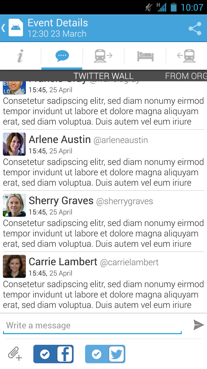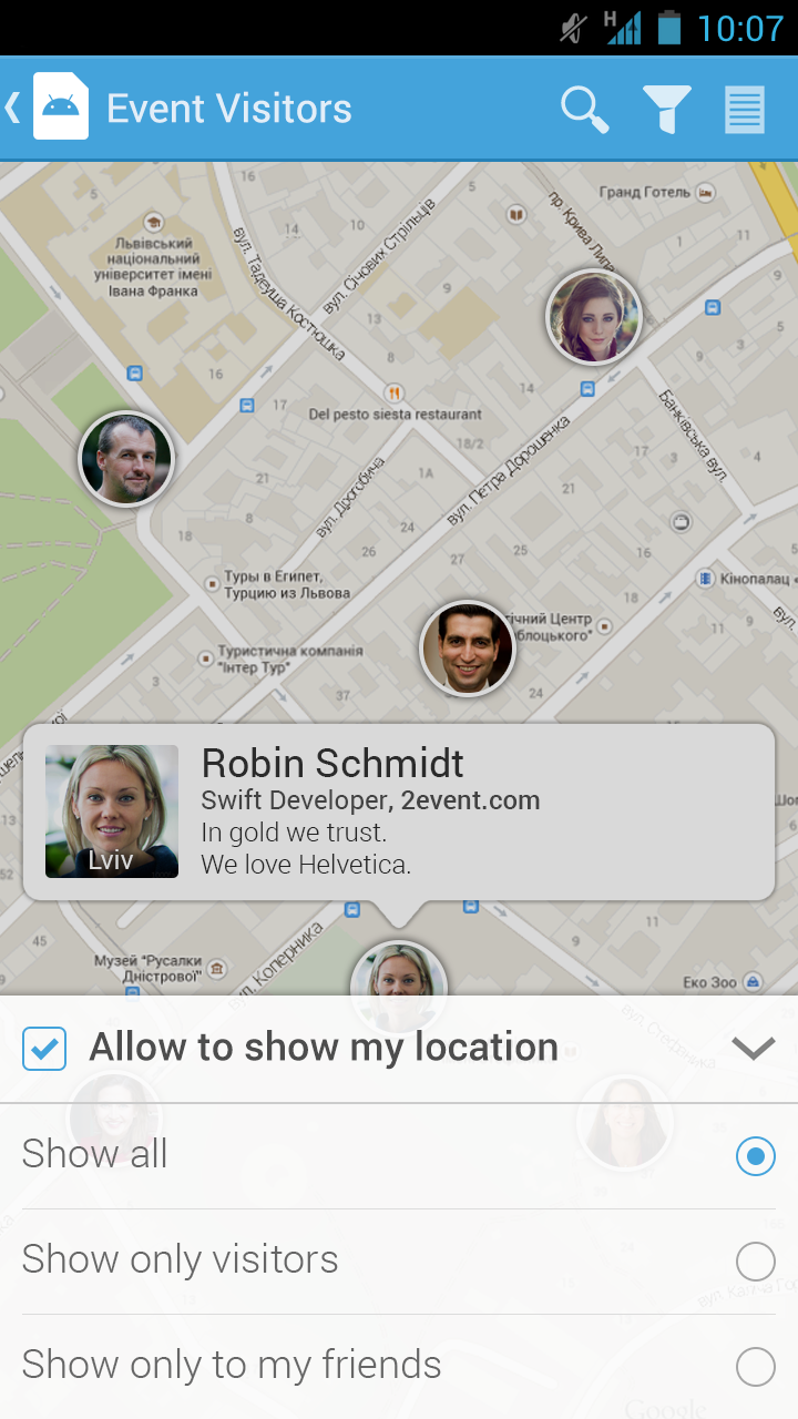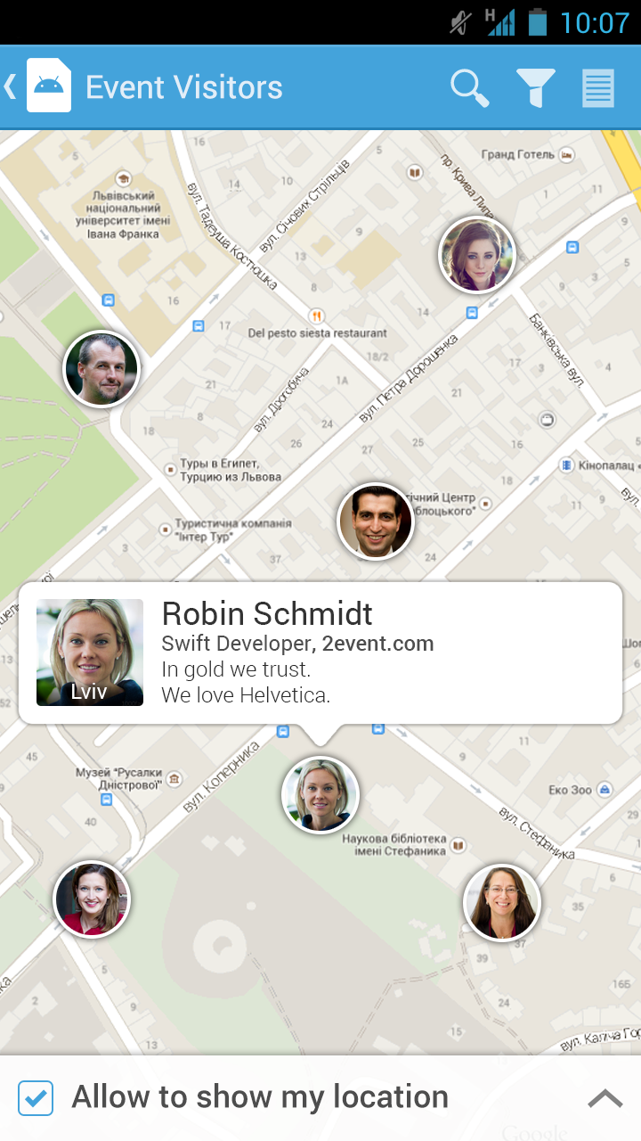 In the end of the event You’ll have not a pack of paper cards and the question :"Who are these people and what are we talk about?" But detailed information about each participant and notes about the meeting in your smartphone.